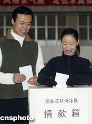 一月十日日,中國國家花樣滑冰隊(duì)在北京首都體育館花樣滑冰訓(xùn)練場舉行向東南亞海嘯災(zāi)民捐款活動。中國花樣滑冰名將申雪、趙宏博當(dāng)場捐獻(xiàn)出一個(gè)月工資。作者:盛佳鵬