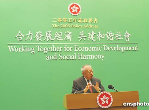 香港行政長(zhǎng)官董建華1月12日在香港立法會(huì)提交2005年施政報(bào)告后,召開記者會(huì)回答記者提問(wèn)。作者:鄧慶樂(lè)