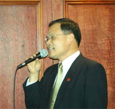 晚宴的主角、新到任的副總領(lǐng)事曠偉霖隨后來到臺(tái)前,向主辦宴會(huì)的僑團(tuán)表示感謝。他表示,在他到任剛剛四十幾個(gè)小時(shí)就收到了宴請(qǐng)的通知,令他十分感動(dòng),僑胞的熱情令他感受到很大的鼓勵(lì)和支持。