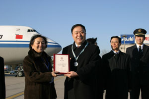 中國紅十字總會(huì)會(huì)長當(dāng)即向中國國際航空股份有限公司頒發(fā)了“中國紅十字博愛”獎(jiǎng)?wù)隆?/p>