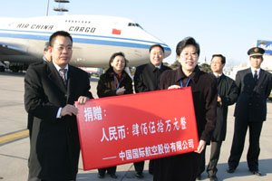 中國國航股份公司董事長李家祥在此間表示:印度洋海嘯造成的巨大災(zāi)難,牽動(dòng)著中國人民的心,也牽動(dòng)著國航職工的心。當(dāng)中國紅十字總會(huì)向國航提出運(yùn)輸緊急救災(zāi)物資的要求后,在運(yùn)力十分緊張的情況下,中國國航取消了十九日的CA9003正常航班,將本架747-200型飛機(jī)專門用于紅十字救災(zāi)物資的承運(yùn),國航為此捐出運(yùn)輸費(fèi)用達(dá)四百五十萬元。