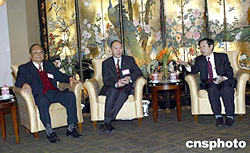 一月二十日,國(guó)務(wù)院港澳辦副主任陳佐洱(右)在北京港澳中心會(huì)見(jiàn)霍震寰團(tuán)長(zhǎng)、曾憲梓名譽(yù)團(tuán)長(zhǎng)率領(lǐng)的香港中華總商會(huì)訪京團(tuán)。中新社記者:史利
