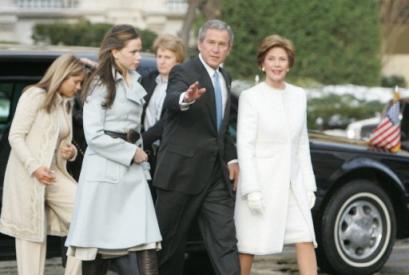 1月20日,美國總統(tǒng)布什和夫人勞拉及其兩個女兒前往圣約翰大教堂。(美聯(lián)圖)