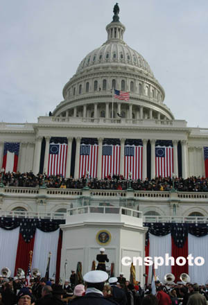 在美國(guó)軍樂隊(duì)的《鼓號(hào)齊鳴》和《向統(tǒng)帥致敬》吹奏樂后,中午十二點(diǎn)整,布什在防彈玻璃圍成的講臺(tái)上發(fā)表就職演說。出人意料的是,布什并沒有談到治國(guó)方略,更沒有提及外交政策,甚至連天天在美國(guó)媒體上連篇累牘的伊拉克問題也沒有說起。