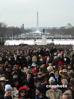 當(dāng)天華盛頓雪后初晴,但天寒地凍,數(shù)十萬人聚集在從國(guó)會(huì)山到華盛頓紀(jì)念碑的街道和草坪上,參加布什的就職典禮。他們當(dāng)中既有為布什連任歡呼者,也有不滿布什政府的抗議示威者。