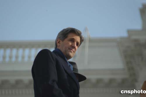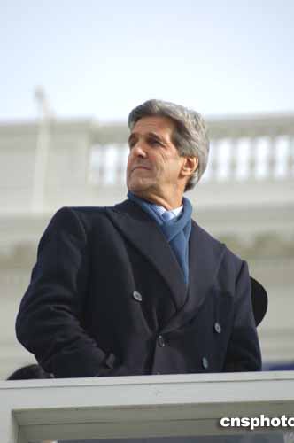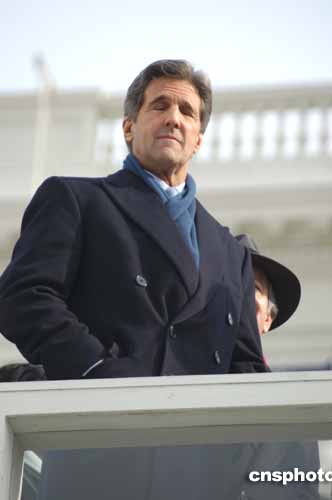 | 在去年底美國大選中敗給布什的民主黨參議員克里20日參加了布什就職典禮,坐在布什演講臺(tái)左側(cè)的第七排。在整個(gè)儀式過程中,克里表情嚴(yán)肅,神情落寞。當(dāng)布什宣誓完畢,全場歡呼時(shí),克里有禮貌地鼓掌,他身旁的另一位嘉賓拍拍他的后背,似在安慰克里。作者:余東暉