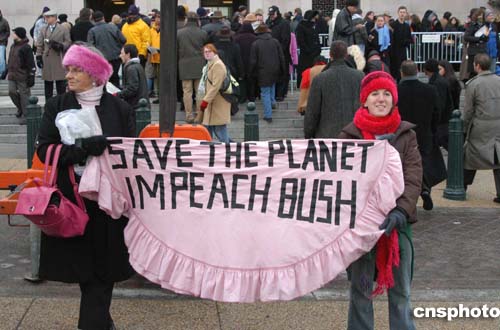 當?shù)貢r間一月二十日,在美國總統(tǒng)布什就職典禮場外,一些示威者抗議布什當政,要求彈劾總統(tǒng)。作者:余東暉