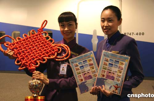 臺灣“華航”為此次首航北京春節(jié)包機活動,特別與桃園郵局合作設計了二OO五年“華航兩岸春節(jié)包機紀念郵票”。郵票中除了有“相逢自是有緣,華航以客為榮”的空服形象,另有五款“華航”目前機隊機型及此次春節(jié)包機航站圖等。它們將作為禮品贈與此次搭乘“華航”春節(jié)包機的旅客。作者:邢利宇