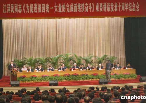國務(wù)院臺灣事務(wù)辦公室主任陳云林在北京人民大會堂舉行的紀念江澤民對臺八項主張發(fā)表十周年大會上,代表中共中央臺辦、國務(wù)院臺辦和海峽兩岸關(guān)系協(xié)會祝臺灣同胞新春愉快,合家歡樂,萬事如意。作者:史利