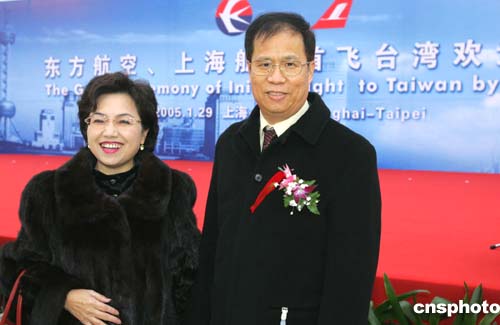 一月二十九日上午八點,上海航空首飛臺灣歡送儀式在浦東國際機場舉行,國民黨籍代表江綺雯出席儀式并與上海臺灣同胞投資企業(yè)協(xié)會會長葉惠德合影。作者:湯彥俊