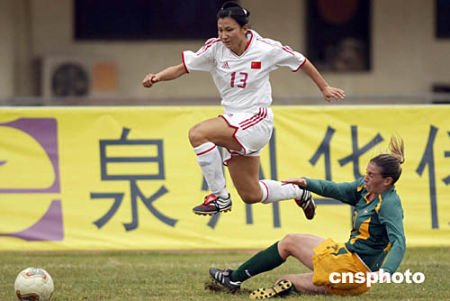 圖為中國女足十三號劉華娜(左)突破對方防守。