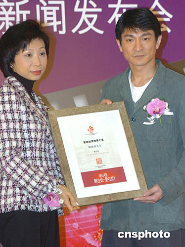 展示香港旅游特色的電視專題片《星星細(xì)語(yǔ)香港情》2月1日在香港開(kāi)鏡﹐在新聞發(fā)布會(huì)上﹐香港旅游發(fā)展局總干事臧明華(左)向在劇中擔(dān)任主角的劉德華致送委任狀。