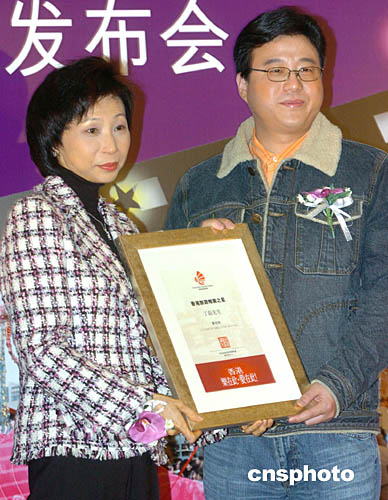 展示香港旅游特色的電視專題片《星星細(xì)語(yǔ)香港情》2月1日在香港開(kāi)鏡﹐在新聞發(fā)布會(huì)上﹐香港旅游發(fā)展局總干事臧明華向在劇中擔(dān)任主角的“網(wǎng)絡(luò)精英”丁磊(右)致送委任狀。