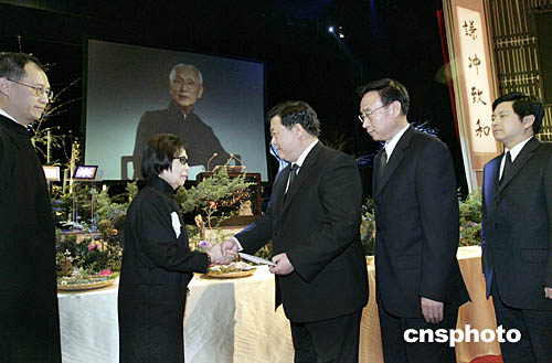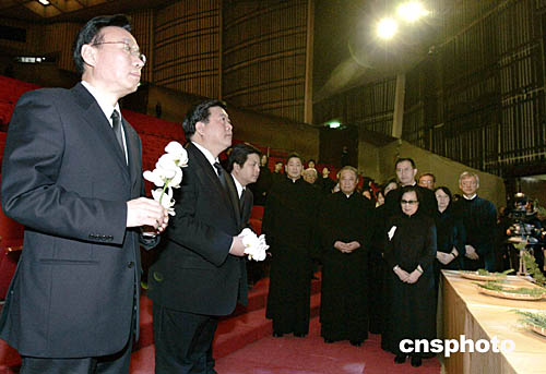 海協(xié)會會長汪道涵的個人代表孫亞夫、李亞飛在追思會上獻花。