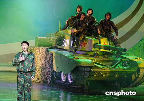 活躍在全國(guó)各種舞臺(tái)的解放軍歌唱演員蔡國(guó)慶,在北京中國(guó)劇院參加2005年軍民迎新春文藝晚會(huì)演出時(shí),坦克徐徐開動(dòng)為其伴舞,形成獨(dú)特的舞臺(tái)情景。中新社記者:王麗南