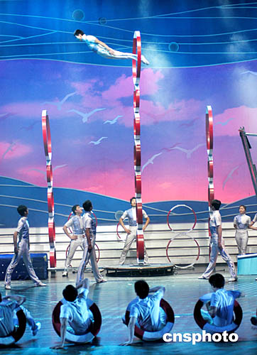 春節(jié)來臨,解放軍沈陽軍區(qū)雜技團(tuán)的演員在2005年軍民迎新春文藝晚會表演雜技《踏浪飛歌》時,以極度高難的翻騰技巧,準(zhǔn)確地穿越用十個軍用救生圈直立羅列的高達(dá)九米的鉆圈技巧,展示解放軍勇敢的精神風(fēng)貌。中新社記者:王麗南