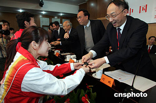 二月四日在北京舉行的中國奧委會全體會議上,新任中國奧委會主席劉鵬向在雅典奧運會獲得獎牌的運動員代表郭晶晶頒發(fā)國際奧委會授予的奧林匹克紀(jì)念章。中新社記者:武仲林