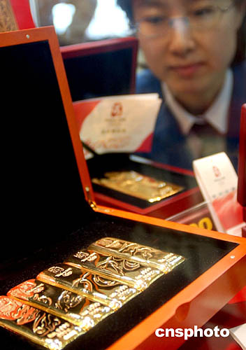 2月4日,北京2008年奧運會會徽紀(jì)念性金條——“北京奧運金”在北京正式發(fā)售。這是百年奧運歷史上首獲授權(quán)的金條類特許產(chǎn)品。該金條成色達99.99%,4種規(guī)格分別為50克、100克、500克、1000克,全國限量發(fā)行2008公斤。作者:韓藝冰