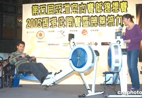 歌影紅星郭富城2月5日在香港出席《第五屆亞洲室內(nèi)賽艇錦標(biāo)賽暨慈善接力賽》記者會(huì),獲委任為“亞洲劃艇之星”,并即場(chǎng)示范室內(nèi)賽艇運(yùn)動(dòng)。作者:鄧慶樂