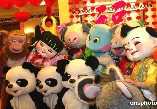 走進(jìn)張燈結(jié)彩的人民大會(huì)堂,噴泉涌動(dòng),鮮花爭(zhēng)艷,迎面兩個(gè)賀歲的“阿!睋碇皦坌恰毕蛉藗児зR新喜,彩燈閃爍的“!弊直磉_(dá)著新春的祝福。大型充氣“雞型”、“龍型”滑梯和“燈籠”、“蘑菇”城堡成了孩子們的樂園。