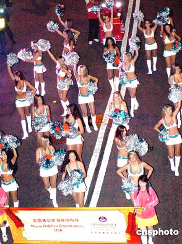 來自美國的邁阿密海豚啦啦隊,二十五位貌美女郎,穿著性感上衣及熱褲,手執(zhí)啦啦球勁歌熱舞,齊齊向觀眾道來“恭喜發(fā)財!wel-cometoHongKong!”
