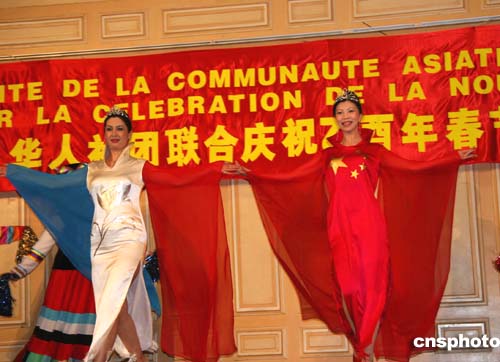 中國傳統(tǒng)春節(jié)大年初一,法國巴黎十三區(qū)政府會議大廳舉行團拜會,演員身穿中法兩國國旗在臺上表演,有如中法國旗飄揚在舞臺。作者:鐘誠