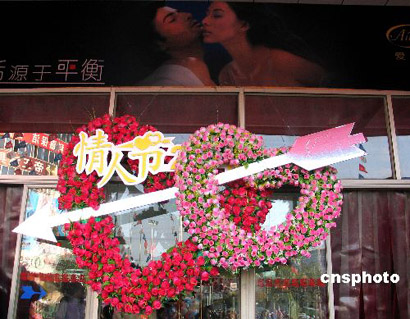 2005年2月11日下午,江蘇省如東縣的商家們“情人節(jié)”促銷忙,各種與節(jié)日有關(guān)的商品琳瑯滿目,各種標(biāo)識(shí)十分搶眼。作者:王必春
