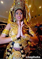 15日晚的泰國布吉島一旅游點上,一首飾點的模特兒在向顧客祝福。海嘯地震過后,這里旅游業(yè)正在逐步復蘇。作者:宋吉河