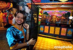 15日晚的泰國(guó)布吉島一旅游點(diǎn)上,一位小老板正在笑迎客人。海嘯地震過后,這里旅游業(yè)正在逐步復(fù)蘇。作者:宋吉河