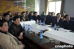 二零零五年二月十六日上午,國家安全生產(chǎn)監(jiān)督管理局局長王顯政(前右一)、副局長趙鐵錘(前左一)一行代表國務(wù)院安委會事故調(diào)查組,在發(fā)生特別重大瓦斯爆炸事故的遼寧海州立井事故現(xiàn)場,聽取事故搶險小組對事故情況以及搶險情況的匯報。遼寧省省長張文岳(前左二)、副省長劉國強(qiáng)(前右二)也參加會議。作者:盛佳鵬