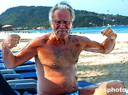 在一處海灘旅游景點(diǎn)上,一位老年游客展示其健壯身軀,表達(dá)海灘旅游的熱趣。海嘯地震過(guò)后,布吉島當(dāng)?shù)叵嚓P(guān)方面積極刺激旅游業(yè)發(fā)展,目前游客人數(shù)日益增多,往日的繁榮正在逐步復(fù)蘇。作者:宋吉河