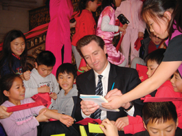 來自尤方玉屏中文學校的數(shù)十位小學生成為慶會的另一亮點,這些滿臉稚氣的學童,排排坐在通往二層的樓梯上,簇擁著年輕英俊的紐森市長,就像遇到偶像明星一樣,紛紛向他索要簽名。
