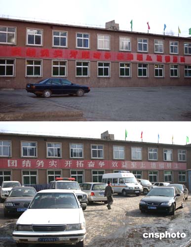 發(fā)生特大礦難的遼寧阜新孫家灣煤礦礦區(qū)的大幅標(biāo)語(yǔ)日前被涂抹遮蓋。上圖顯示“效益至上”的標(biāo)語(yǔ)被涂抹遮蓋;下圖顯示“效益至上”標(biāo)語(yǔ)未被涂抹前十分醒目。二月十四日發(fā)生的孫家灣煤礦特大礦難,已知造成二百一十四名礦工死亡,是四十多年來(lái)中國(guó)煤礦礦難事故死亡人數(shù)最多的一次。作者:中新社