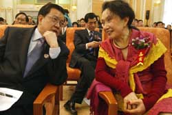 “2004中華十大財智人物”評選活動,二月二十六日在北京人民大會堂舉行頒獎儀式。博鰲亞洲論壇秘書長龍永圖(左)獲得“2004中華十大財智人物”特別獎。伊世曼柯達(dá)公司全球副總裁、大中華區(qū)主席葉鶯獲得年度獎。作者:任海霞