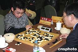 “九段高手克星”古靈益二段,在2月28日上午舉行的“玉溪杯”第四屆中國圍棋西南棋王賽首輪比賽中,戰(zhàn)勝老師、棋圣聶衛(wèi)平九段,晉級下一輪比賽。圖為師徒二人賽后進行復(fù)盤研磋。作者:楊杰