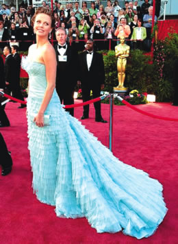 作為奧斯卡上屆影后的查理茲·塞隆,今年當(dāng)然不能在服裝上輸給“小輩”。一層層的細(xì)紗打成小褶羅列成寶塔形,讓人一望就是工藝不凡。層層疊疊的感覺外加淡淡的藍(lán)綠色調(diào),讓這位美女就像美人魚一般美麗動(dòng)人。