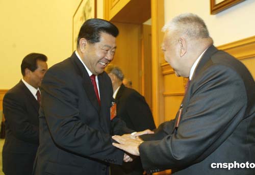 三月三日,全國政協(xié)十屆三次會議在北京人民大會堂開幕,全國政協(xié)主席賈慶林和香港特首董建華在會前互致問候。作者:廖文靜