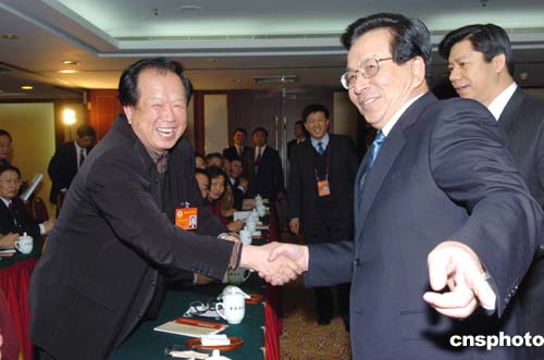 三月四日,中共中央政治局常委、國家副主席曾慶紅到北京華潤飯店參加全國政協(xié)民進(jìn)、民盟聯(lián)組會議時,應(yīng)著名導(dǎo)演李前寬的要求與其握手。作者:陳文