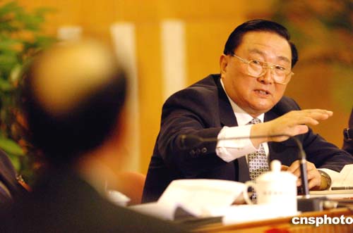 中共中央政治局常委羅干三月六日到全國人大福建團與代表們一起審議溫家寶總理所作的政府工作報告。作者:陳文