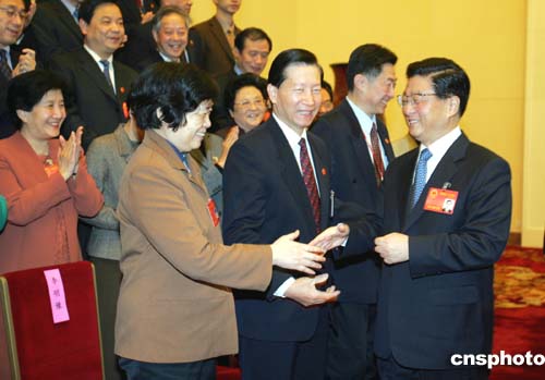 圖:黃菊與上海人大代表握手致意