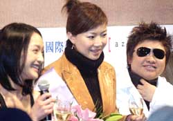 三月六日,在北京舉行的中國(guó)內(nèi)地影視、歌壇紅星周迅新專輯《偶遇》上市發(fā)行儀式上,內(nèi)地歌手韓紅(右)、葉蓓(中)在會(huì)上向周迅表示祝賀。作者:錢興強(qiáng)
