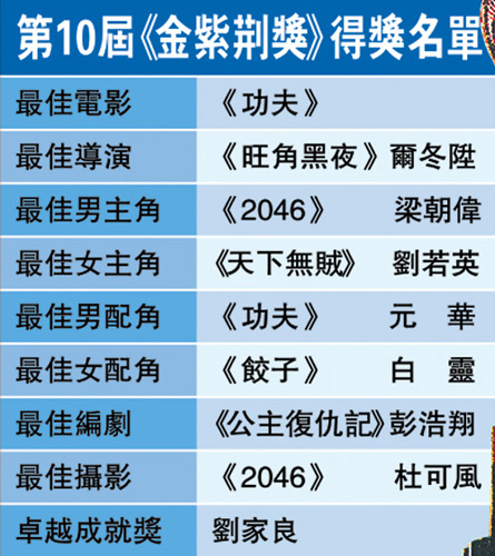 獲得本屆“金紫荊獎(jiǎng)”十大華語片獎(jiǎng)的影片是:《旺角黑夜》、《新警察故事》、《天下無賊》、《203040》、《2046》、《功夫》、《十面埋伏》、《大事件》、《公主復(fù)仇記》、《餃子》。