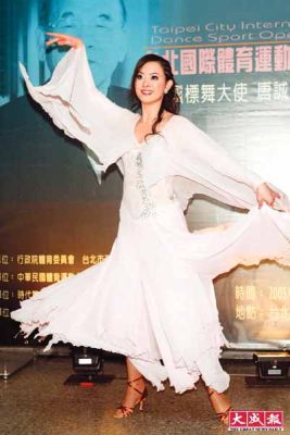 昨晚于臺師大分部舉行的“2005臺北國際標(biāo)準(zhǔn)舞大賽”,邀請中國、丹麥等舞林高手飆舞。劉真特地以一身雪白舞衣,擔(dān)任“國標(biāo)舞大使”唐誠精采舞姿介紹人,她說:“唐誠67歲才開始學(xué)舞,我會有今天這成就,受唐誠影響很深!