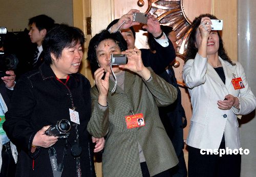 3月6日上午,出席十屆全國人大三次會議的山東代表團在人民大會堂山東廳舉行全體會議,會前,代表們紛紛在山東廳前相互拍照留念。作者:王輝