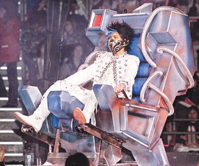 演唱會全場爆滿準時開始。舞臺以超時空科幻設計,機械臂緩緩上升,舞蹈員從天而降和從觀眾席跑上舞臺。戴銀黑色面具的基仔坐太空椅出場,以《必殺技》揭開序幕,額前藍色駁發(fā)和閃鉆耳環(huán)非常搶眼;兄笅屵湟瞾砼鯃觯笥^眾大力拍掌支持。