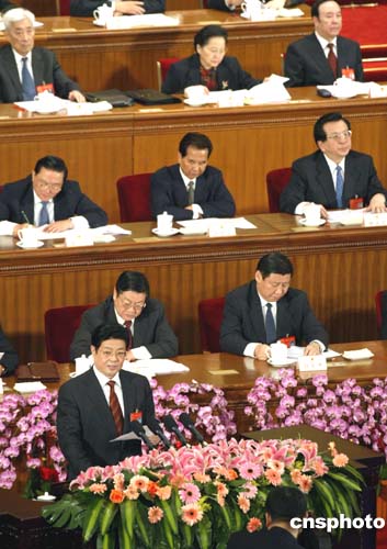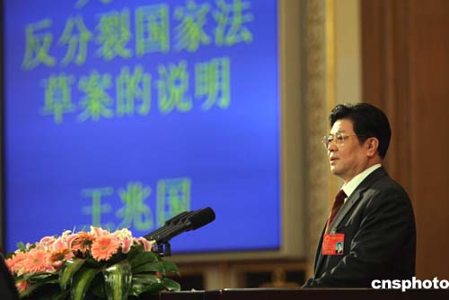 三月八日,十屆全國(guó)人大三次會(huì)議第二次全體會(huì)議在北京人民大會(huì)堂舉行。全國(guó)人大常委會(huì)副委員長(zhǎng)王兆國(guó)作關(guān)于《反分裂國(guó)家法(草案)》的說(shuō)明。作者:廖文靜