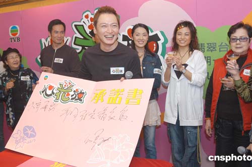 無線電視劇《心花放》3月9日在香港舉行慶祝收視祝捷會,影視紅星陶大宇在祝捷會寫下承諾書:若該劇收視平均高達35點,將自掏腰包宴請臺前幕后。作者:鄧慶樂