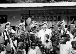 望著這些可憐的孩子,潘興太等隊(duì)員決定親自動(dòng)手,利用原來(lái)裝醫(yī)療用品的木箱,為師生制作一批課桌椅。一個(gè)星期后,當(dāng)隊(duì)員們將20多張像模像樣的課桌椅送到該校時(shí),180多名“黑孩子”和他們僅有的4位老師已早早地列隊(duì)守候在校門(mén)口。孩子們一接過(guò)隊(duì)員們親手做的課桌和板凳,“CHINA”、“BEI鄄JING”聲就不絕于耳。