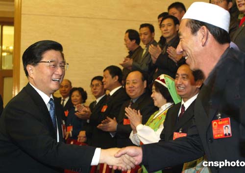 三月十日,全國人大寧夏代表團(tuán)在北京人民大會(huì)堂審議全國人大常委會(huì)工作報(bào)告和兩高報(bào)告。中共中央政治局常委、國務(wù)院副總理黃菊參加審議,聽取代表建議。作者:廖文靜