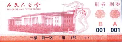 陽(yáng)光下就可以看到票面內(nèi)的水印,不過(guò)人民幣上是毛主席頭像,這里是“人民大會(huì)堂”等字樣;新票上還有同人民幣差不多的金絲線。此外新票也有熒光顯示,在驗(yàn)鈔機(jī)下,“人民大會(huì)堂”幾個(gè)字會(huì)發(fā)出藍(lán)光,和鈔票上的“中國(guó)人民銀行”效果一樣。據(jù)悉新票還有其他防偽措施,但為保密起見,人民大會(huì)堂工作人員拒絕向外透露。不過(guò)據(jù)演出方介紹,入場(chǎng)時(shí)你會(huì)發(fā)現(xiàn)所有的入口都有一臺(tái)驗(yàn)鈔機(jī),驗(yàn)鈔機(jī)擔(dān)任起了驗(yàn)票的功能,所有人必須由這臺(tái)驗(yàn)鈔機(jī)驗(yàn)票才能進(jìn)場(chǎng)。